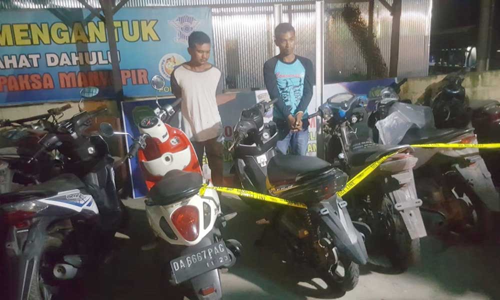 “Kami dapat mengamankan total 9 unit roda dua hasil curian pelaku yaitu 3 unit Honda Scoopy, 2 unit Yamaha Mio, 1 unit Honda Supra X 125, 1 unit Suzuki Shogun, 1 unit Honda Vario, dan 1 Yamaha Vixion dan masih ada lagi 2 unit roda dua lainnya yang masih dalam pencarian,” beber Kasat Reskrim Polres Banjarbaru.