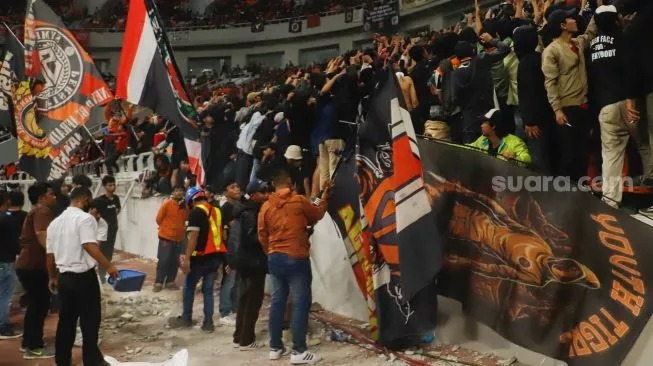 Diketahui, pembatas tribun penonton JIS jebol saat acara peluncuran utama atau grand launching stadion, Minggu (24/7/2022). Pagar yang menjadi pembatas antara penonton dengan lapangan roboh.