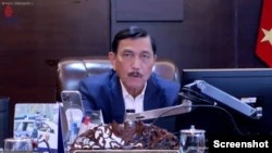 Menko Marves Luhut Binsar Pandjaitan dalam telekonferensi pers di Jakarta, Senin (7/2/2022) mengatakan pemerintah menetapkan level 3 PPKM di wilayah Jabodetabek hingga Bali menyusul kenaikan kasus COVID-19. Foto : VOA
