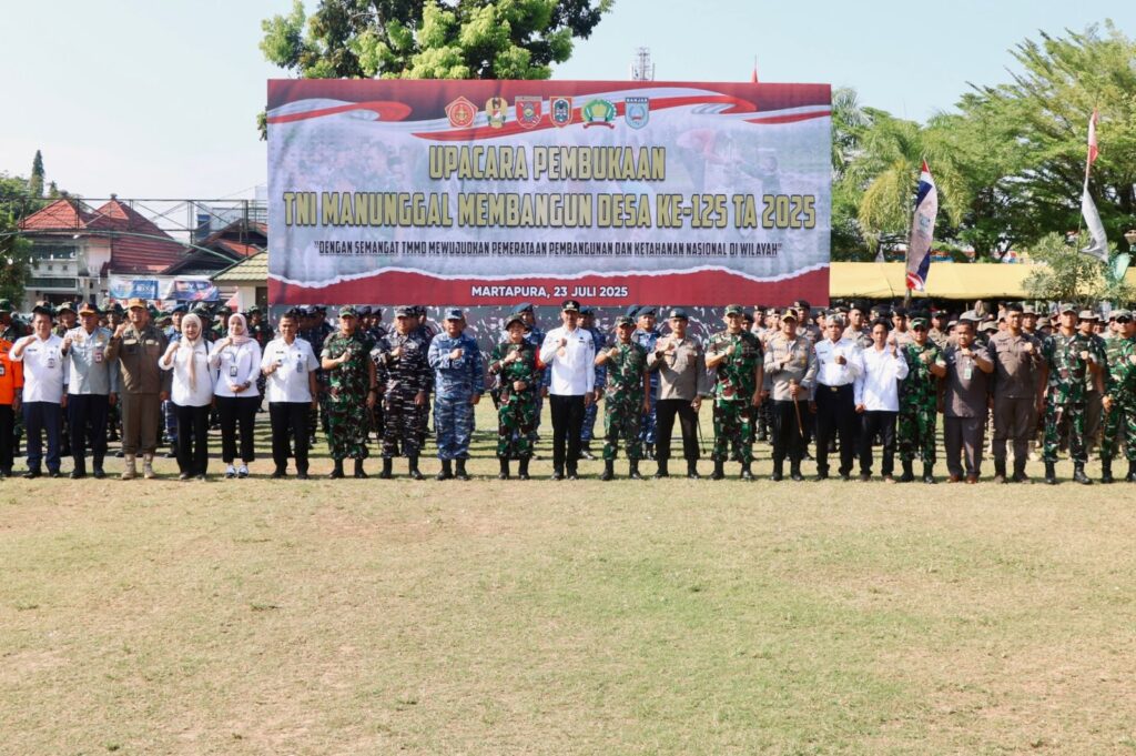 KANALKALIMANTAN.COM, MARTAPURA – Bupati Banjar menjadi inspektur upacara pada pelaksanaan TNI Manunggal Membangun Desa (TMMD) ke-125 Tahun Anggaran 2025 di Alun-alun Ratu Zalecha, Martapura, Rabu (23/7/2025) pagi.