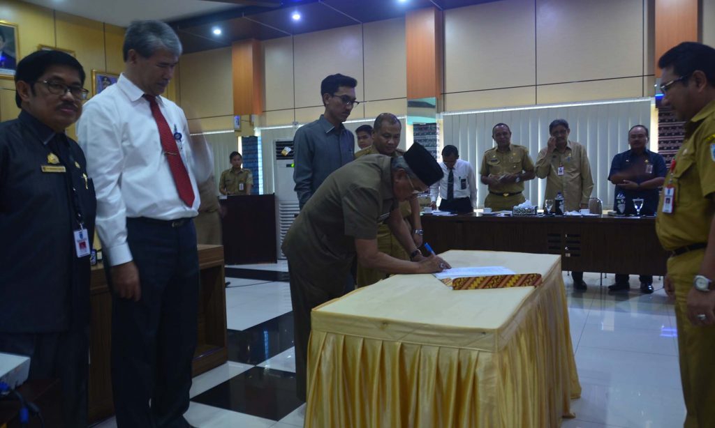 Penandatangan disaksikan Bupati Banjar KH Khalilurrahman, Wakil Bupati Banjar H Saidi Mansyur, Sekda Banjar Ir H Nasrunsyah dan Kepala Perwakilan BKPP Provinsi aSelatan Salamat Simanullang, serta Inspektur Kabupaten Banjar Rusdi, di Aula Barakat Pemkab Banjar, Senin (9/4).