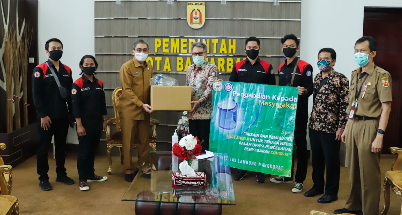 Ratusan pelindung wajah ini diserahkan Wakil Rektor Bidang Kemahasiswaan ULM Dr Ir H Muhammad Fauzi MP kepada Wakil Wali Kota Banjarbaru Darmawan Jaya Setiawan untuk selanjutkan didistribusikan kepada Dinas Kesehatan dan Direktur RSDI Kota Banjarbaru, Selasa (12/5/2020).