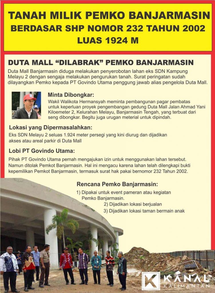 Senbelumnya, Pemko Banjarmasin akan mengukur ulang lahan seluas 1.924 meter di samping Duta Mall yang dipagari seng oleh mall terbesar di Banjarmasin tersebut. Surat peringatan pertama untuk pembongkaran lahan itu sudah dilayangkan ke Duta Mall beberapa waktu lalu.