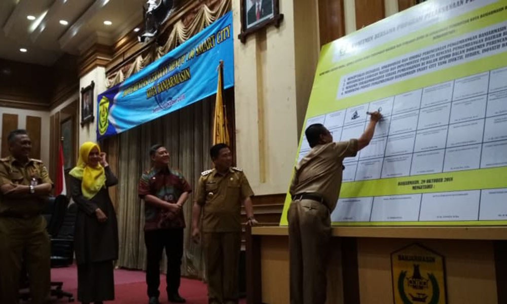Senin (29/10), para pejabat lingkup pemko Banjarmasin melakukan ikrar dan penandatanganan guna merealisasikan Kota Banjarmasin sebagai smart city. Komitmen tersebut dalam bentuk ikrar saat pergelaran bimbingan teknis tahap 4 implementasi gerakan menuju 100 smart city Kota Banjarmasin di aula Kayuh Baimbai.