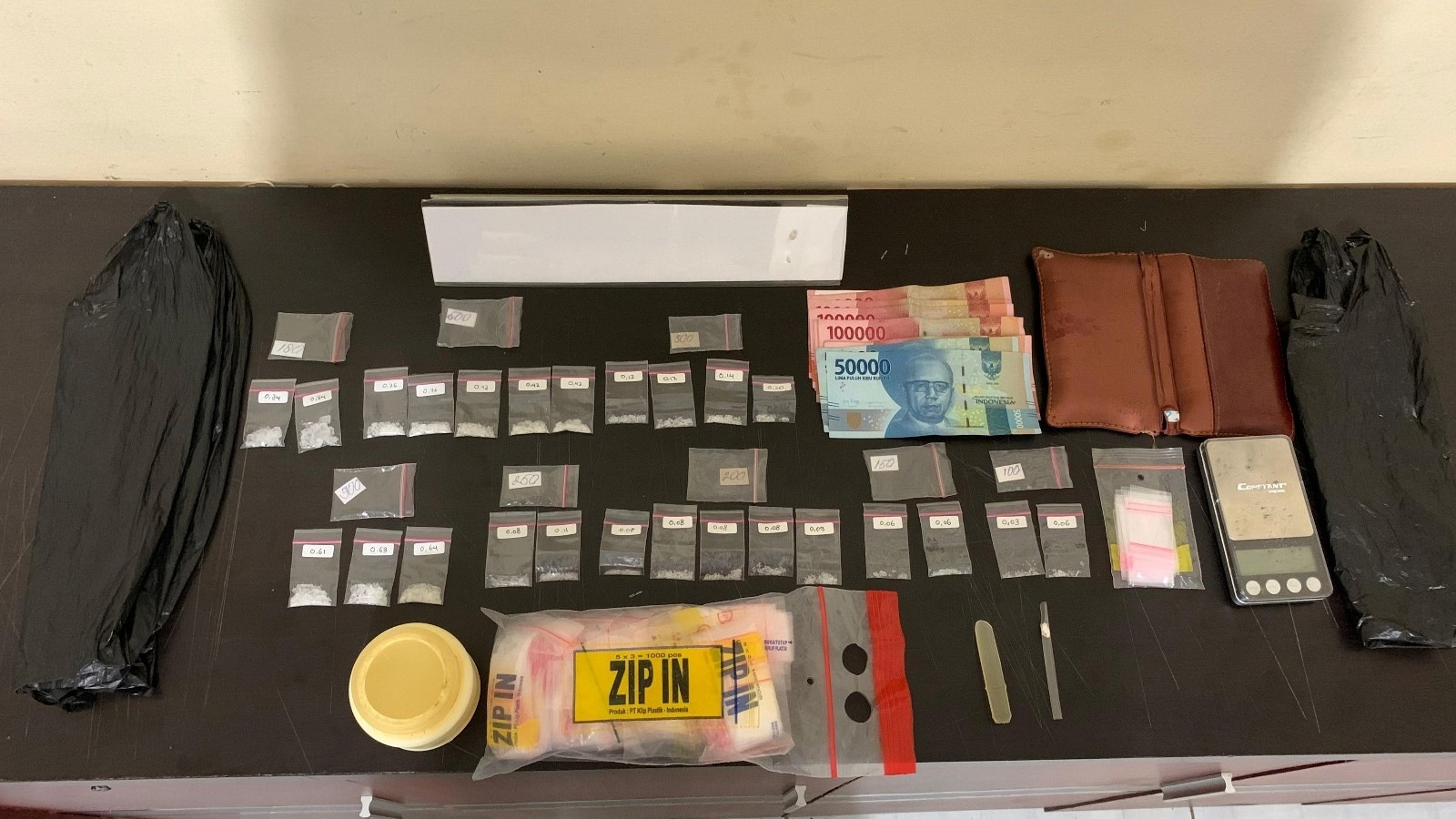 Alhasil dari penggeledahan tersebut, ditemukan satu buah toples kecil warna putih yang berisikan 25 paket narkotika jenis sabu dengan berat keseluruhan 11,32 gram -berat bersih 6,82 gram-.