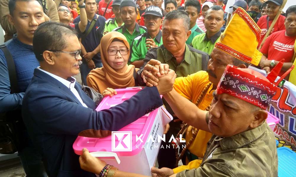 Ada sebanyak delapan box bukti dukungan mulai dari dukungan KTP dan tandatangan yang juga telah didaftarkan ke pihak notaris Kotabaru. “Kami menyerahkan 11 ribu berkas pernyataan penolakan tambang disertai fotokopi KTP dari warga 7 kecamatan di Kotabaru yang sudah ditandatangani Notaris,” tegas Hariyandi saat menyerahkan penggalangan tandatangan warga kepada Andi M Asrun.