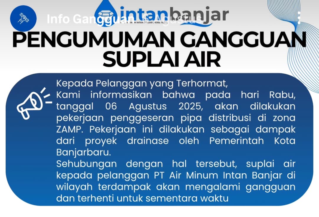 KANALKALIMANTAN.COM, BANJARBARU – Manajemen PT Air Minum (PTAM) Intan Banjar melalui akun resminya di instagram mengumumkan gangguan distribusi air bersih yang akan terjadi di sejumlah daerah di Kota Banjarbaru.