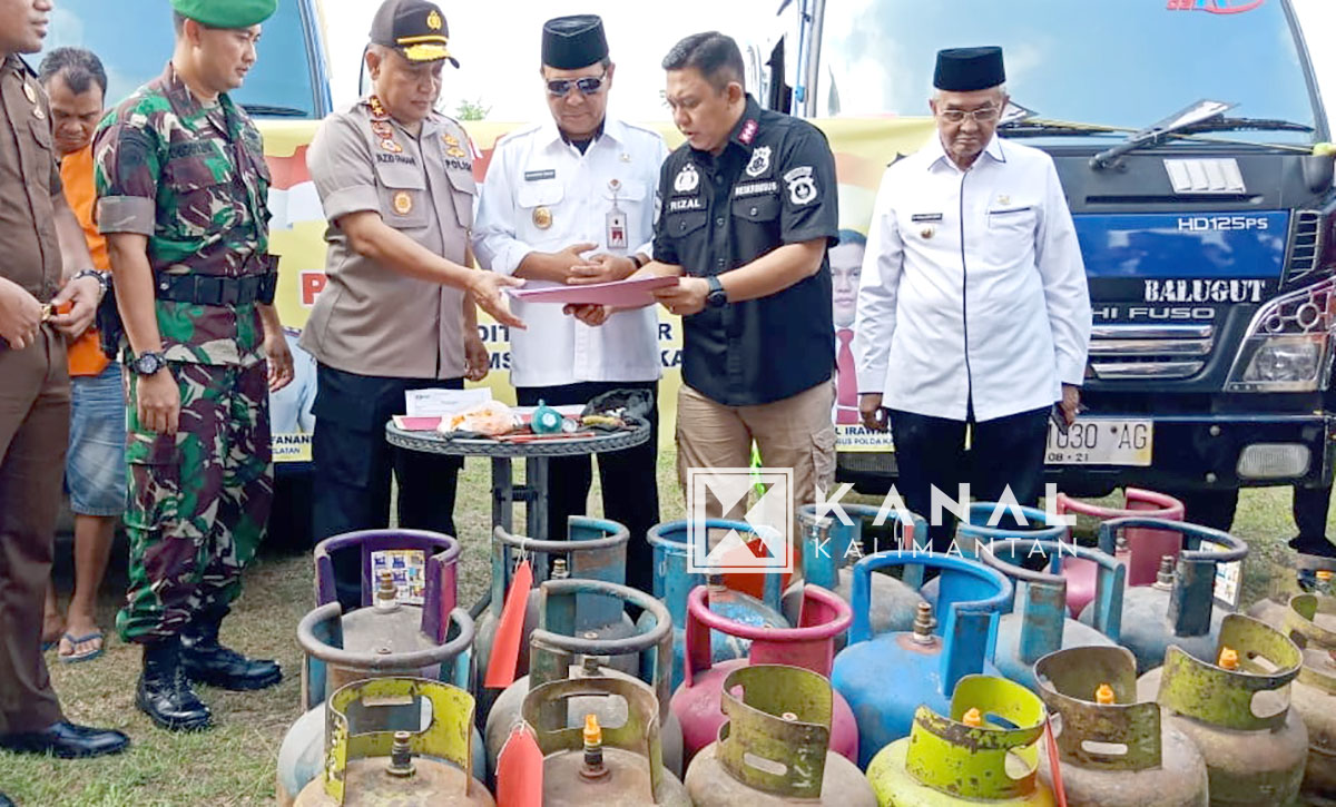 Adapun barang bukti yang diamankan berupa, tabung 12 Kg berisi (5 buah), tabung 12 Kg kosong (6 buah), tabung isi setengah 12 Kg (1 buah), tabung 3 Kg berisi (23 buah), tabung 3 Kg kosong (18 buah), pipa penyuling 2 buah, karet pengait sebanyak 2 buah, regulator 1 buah, karet katup tabung gas sebanyak 37 buah, segel tabung gas warna jingga 40 biji, dan segel tabung gas warna putih sebanyak 6 buah.