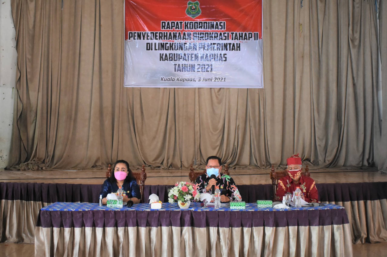 KANALKALIMANTAN.COM, KUALA KAPUAS – Pemerintah Kabupaten (Pemkab) Kapuas menggelar rapat koordinasi penyederhanaan birokrasi tahap II menyusul Surat Mendagri Nomor 060/1970/OTDA tanggal 26 Maret 2021 perihal penyederhanaan birokrasi pada jabatan administrasi di lingkungan pemerintah daerah provinsi dan kabupaten/kota, di aula Bupati Kapuas, Kamis (3/6/2021).