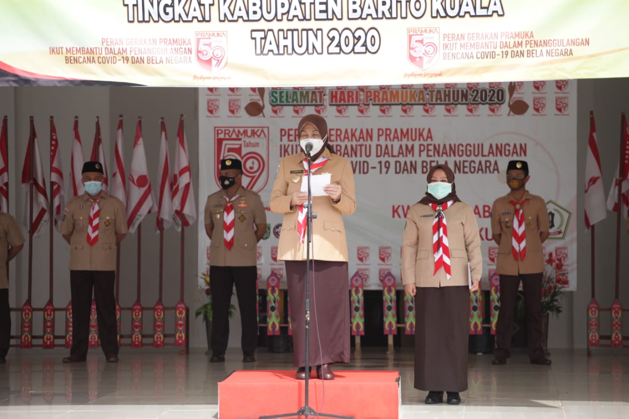 Dengan tetap mematuhi protokol kesehatan, upacara yang berlangsung di halaman kantor Bupati Batola ini dipimpin Bupati Hj Noormiliyani AS, Ketua Mabicab Gerakan Pramuka Batola.