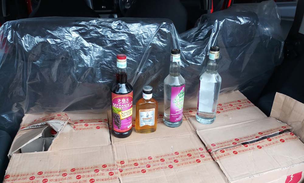 Ratusan Barang bukti miras ini ditemukan petugas didalam mobil milik pelaku dengan rincian 46 Botol MANSION HOUSE merk WHISKY, 36 Botol ANGGUR MERAH merk MCDONALD, 35 Botol Minuman Beralkohol Jenis Anggur Putih merk Japan Anggur.