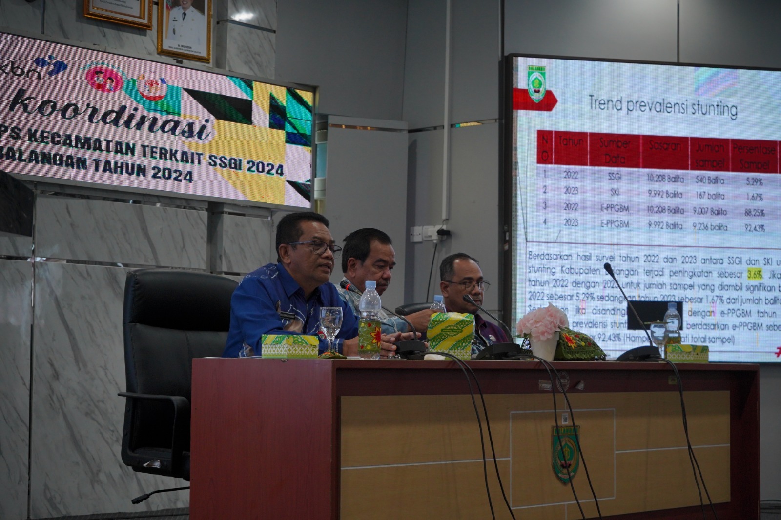 Rapat koordinasi dipimpin Asisten Perekonomian dan Pembangunan Setda Balangan, Tuhalus, dihadiri Kepala Badan Perencanaan, Pembangunan, Riset dan Inovasi Daerah Rakhmadi Yusni, Kepala Dinas Pemberdayaan Perempuan dan Perlindungan Anak, Pengendalian Penduduk dan Keluarga Berencana, Pemberdayaan Masyarakat Desa Akhmad Nasa’i, dan Plt Kepala Dinas Kesehatan Ahmad Sauki.