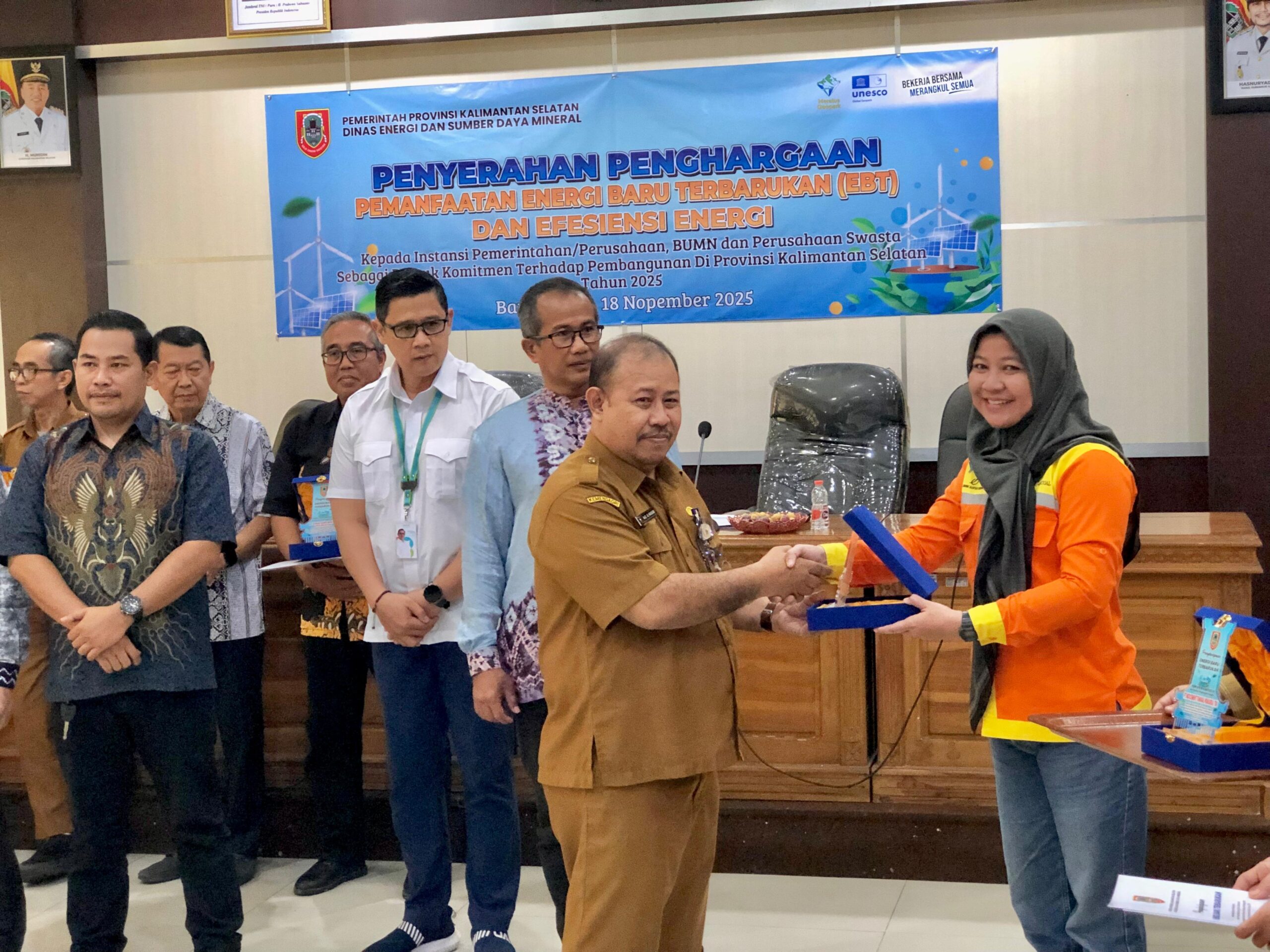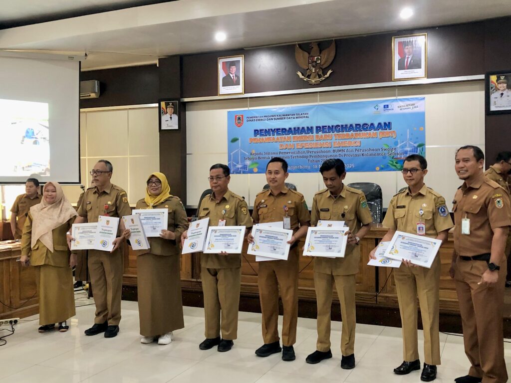 Penghargaan diserahkan Sekretaris Dinas ESDM Provinsi Kalsel, Nasrullah dan jajaran dalam seremoni penghargaan yang berlangsung di gedung lantai 3 kantor Dinas ESDM Kalsel, Selasa (18/11/2025).