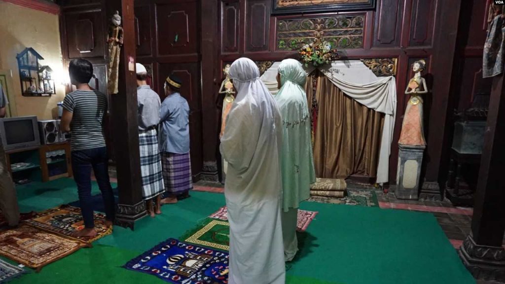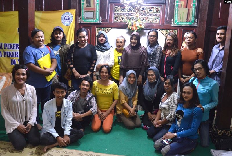 Shinta Ratri dan para waria pesantren Al Fatah melakukan shalat jamaah. foto: K. Varagur/VOA