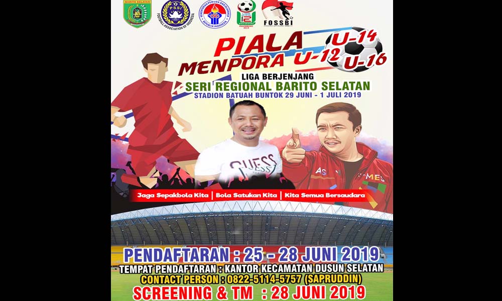 Bupati Barsel H Eddy Raya Samsuri mengatakan, piala Menpora ini diperuntukan bagi para pemain U-12, U-14 dan U-16, yang mana merupakan liga berjenjang seri regional Barsel. “Untuk pendaftaran dimulai tanggal 25-28 Juni, dan lokasi pertandingan sepakbola ini akan digelar di Stadion Batuah Buntok pada tanggal 29 Juni-1 Juli tahun 2019,†kata Eddy Raya kepada Kanalkalimantan.com.