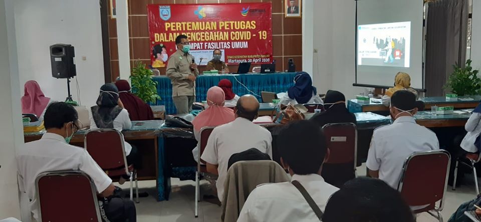 KANALKALIMANTAN.COM, MARTAPURA – Petugas sanitarian dalam pencegahan penularan Covid-19 di tempat fasilitas umum (TFU) menggelar pertemuan, Senin (20/4/2002) di aula Dinas Kesehatan Kabupaten Banjar.