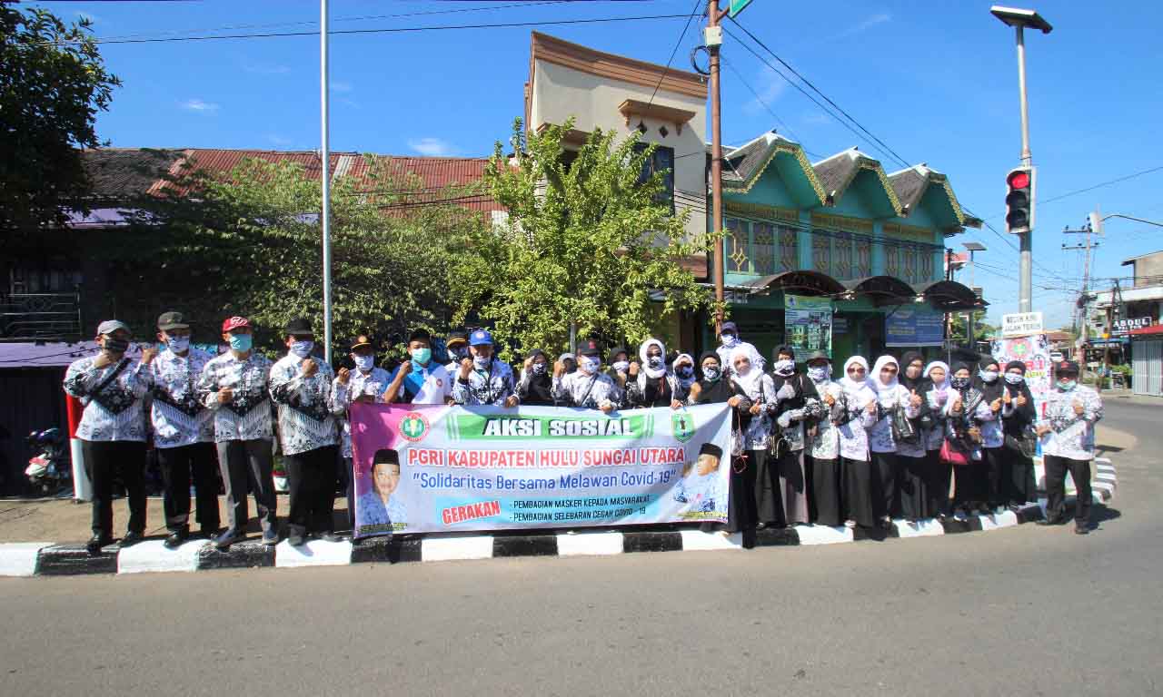 KANALKALIMANTAN.COM, AMUNTAI – Tak mau ketinggalan untuk solidaritas bersama melawan Covid-19, Persatuan Guru Repoblik Indonesia (PGRI) Kabupaten Hulu Sungai Utara (HSU) juga menggelar aksi sosial pembagian ratusan masker kain dan selebaran imbauan kepada warga.