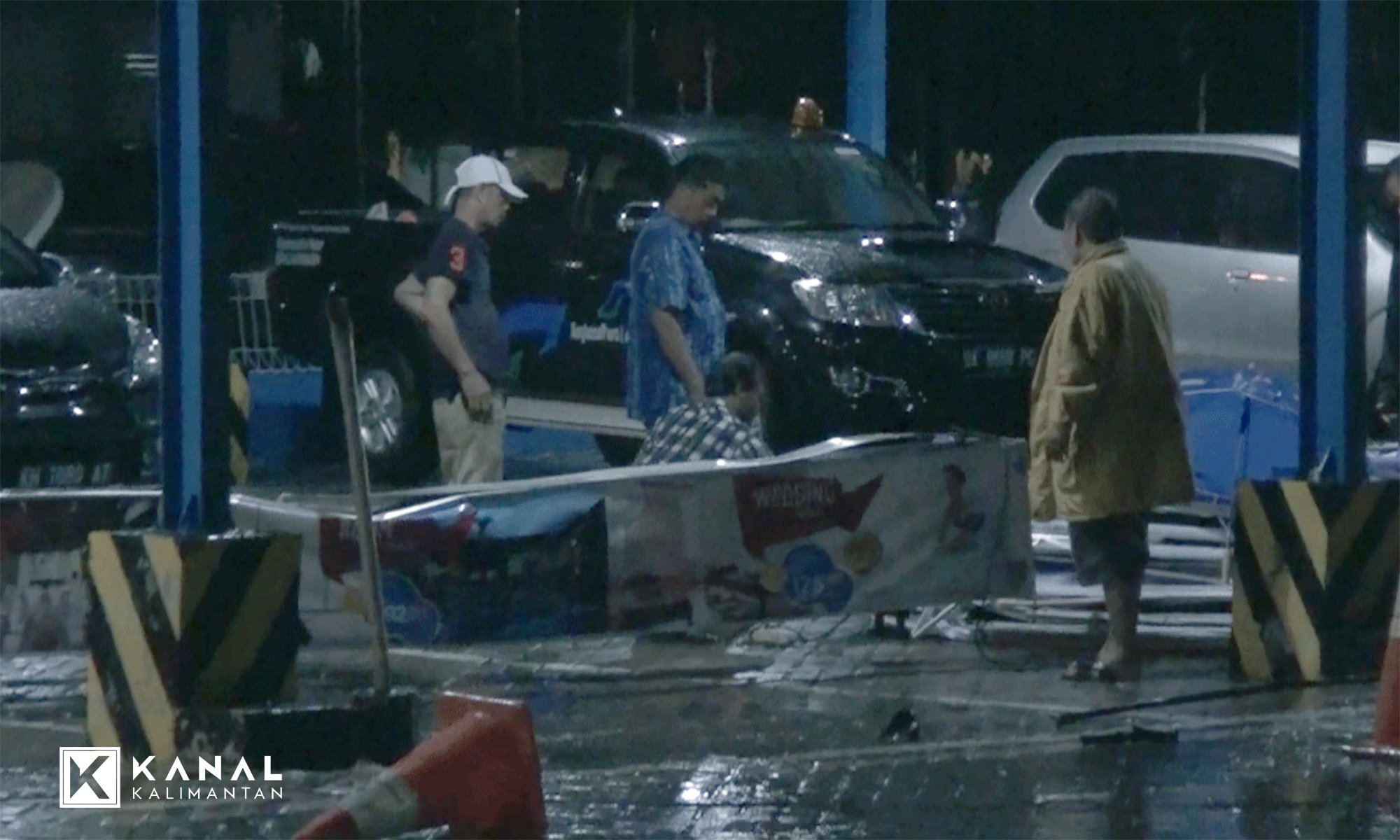 BANJARBARU, Dua kendaraan berjenis Toyota Rush dan Toyota Hilux menjadi korban robohnya baliho raksasa di Bandara Syamsuddin Noor, akibat hujan lebat dan angin ribut yang terjadi di Banjarbaru, Senin (13/11) malam.