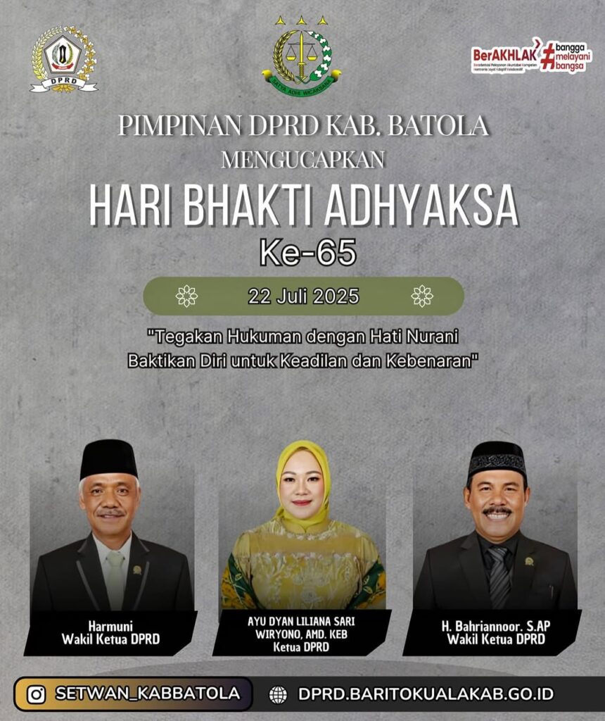 “Atas nama Pimpinan DPRD Kabupaten Barito Kuala, kami mengucapkan selamat Hari Bhakti Adhyaksa ke-65. Semoga insan Adhyaksa senantiasa menegakkan hukum dengan hati nurani, mengabdi demi kebenaran, dan mewujudkan keadilan bagi masyarakat serta bangsa,” ujar Ayu Dyan di Marabahan, Selasa (22/7).