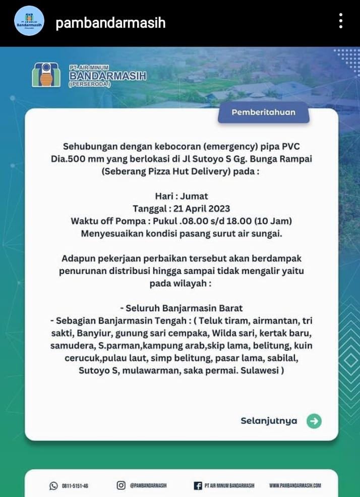 “Sehubungan dengan kebocoran (emergency) pipa PVC diameter 500 mm maka dilakukan off pompa dari Pukul 08.00 Wita sampai dengan 18.00 Wita,” isi pengumuman PAM Bandarmasih, di akum instagram @PAMBANDARMASIH yang diposting Jumat (21/4/2023) sekitar pukul 05.00 Wita.