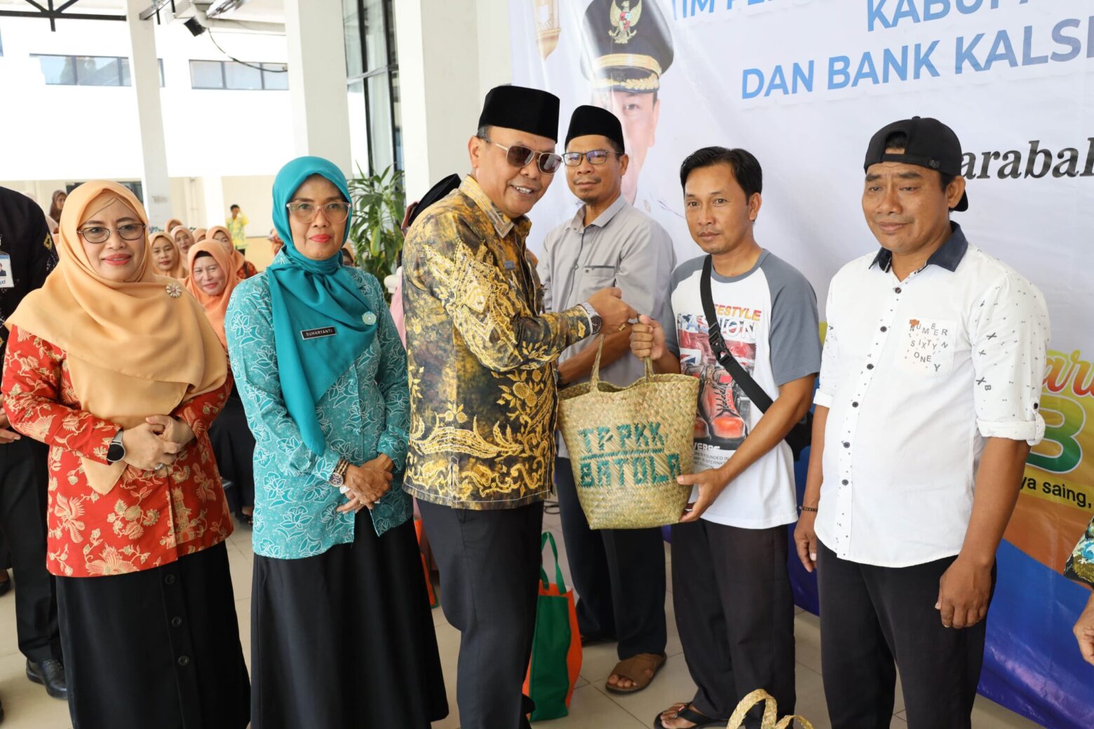 Setelah membuka acara, Mujiyat bersama Pj Ketua TP PKK Batola, Suharyanti Mujiyat, Ketua DWP Herwina Zulkifli, Kepala Dinas PMD Moch Aziz, dan Kepala Bank Kalsel Marabahan Deddy Setiawan, menyerahkan sembako secara simbolis.