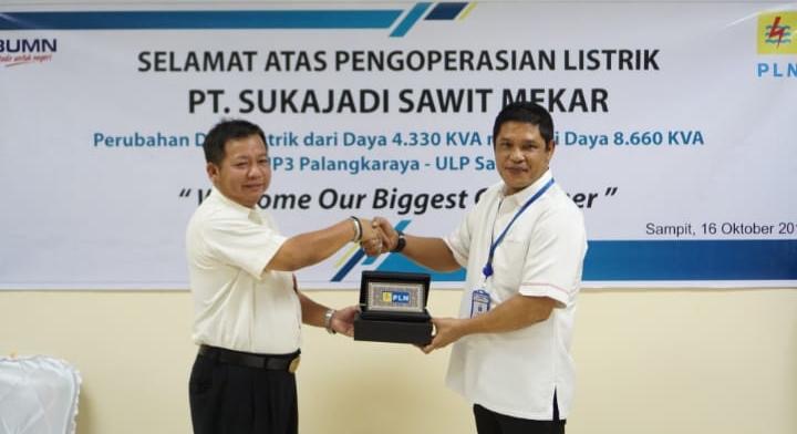 SAMPIT, PT PLN (Persero) Unit Induk Wilayah Kalimantan Selatan dan Kalimantan Tengah resmi menyalurkan listrik sebesar 8.660.000 VA kepada PT Sukajadi Sawit Mekar.