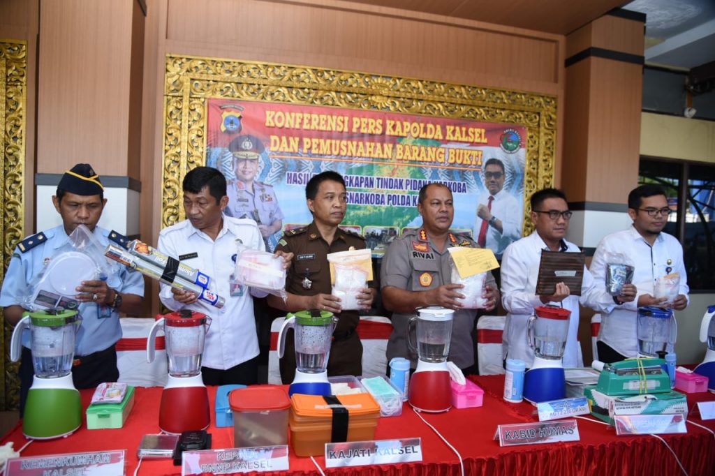 Kapolda Kalsel Irjen Yazid Fanani, M.Si melalui Direktur Resnarkoba Polda Kalsel Kombes Wisnu Widarto SIK, didampingi Kabid Humas Polda Kalsel Kombes Mochamad Rifa’i SIK, menyebut narkoba itu diperoleh dari 24 kasus dengan jumlah tersangka sebanyak 36 orang.