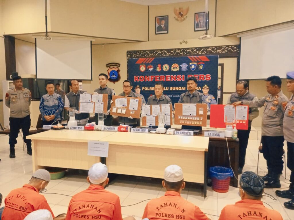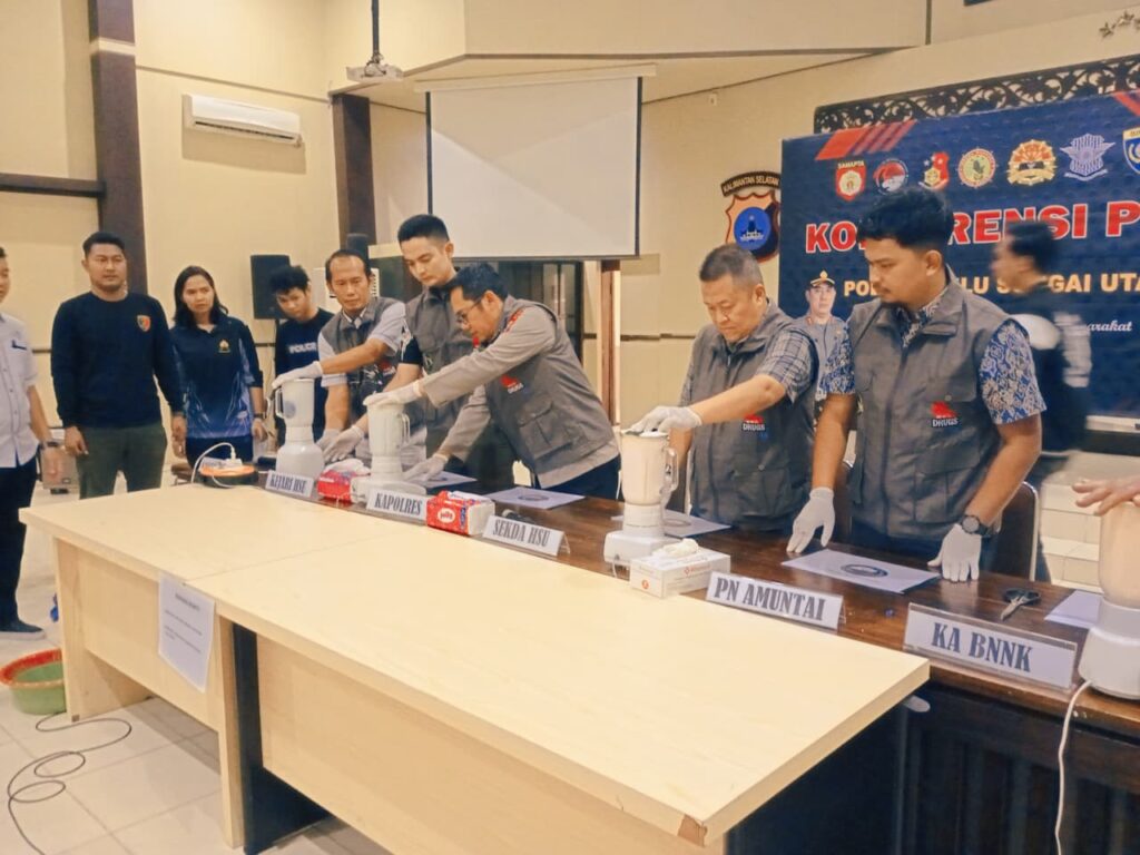 Pemusnahan barang bukti narkotika dilakukan Polres HSU saat menggelar konferensi pers sekaligus pemusnahan barang bukti narkotika hasil pengungkapan kasus periode Juni – Agustus 2025.