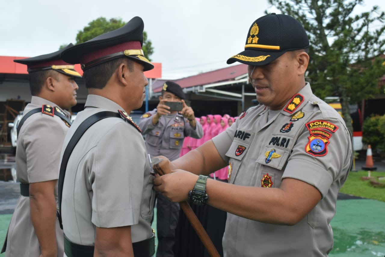 Sebelum apel gelar pasukan digelar acara serah terima jabatan dari Waka Polres yang sebelumnya dijabat Kompol HM Tukiman SH MH digantikan Kompol Irwan SST yang sebelumnya bertugas di Polda Kalsel. (dew)
