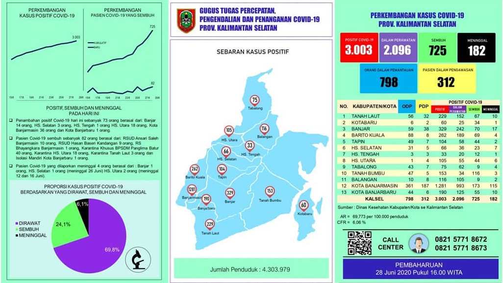 Menurut Juru Bicara Gugus Tugas Percepatan Penanganan Covid-19 Kalsel, Muhammad Muslim pada Minggu (28/6/2020) tercatat ada 73 kasus baru positif Covid-19. Dimana, 4 kasus berasal dari pasien dalam pengawasan (PDP) yang terkonfirmasi positif Covid-19. Dengan rincian tigas kasus RSUD Ulin Banjarmasin (2 kasus dari Kota Banjarmasin dan 1 kasus dari Kabupaten Hulu Sungai Tengah) dan 1 kasus dari RSUD Ratu Zaleha Martapura yang berasal dari Kabupaten Banjar.