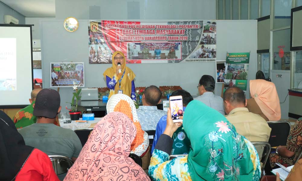 BANJARBARU, Ketua TP  PKK Hj Ririen Nadjmi Adhani membuka sosialisasi Pos Pelayanan Teknologi (Posyantek) yang digelar Dinas Pengendalian Penduduk KB PMP dan PA Kota Banjarbaru, Selasa (19/2).