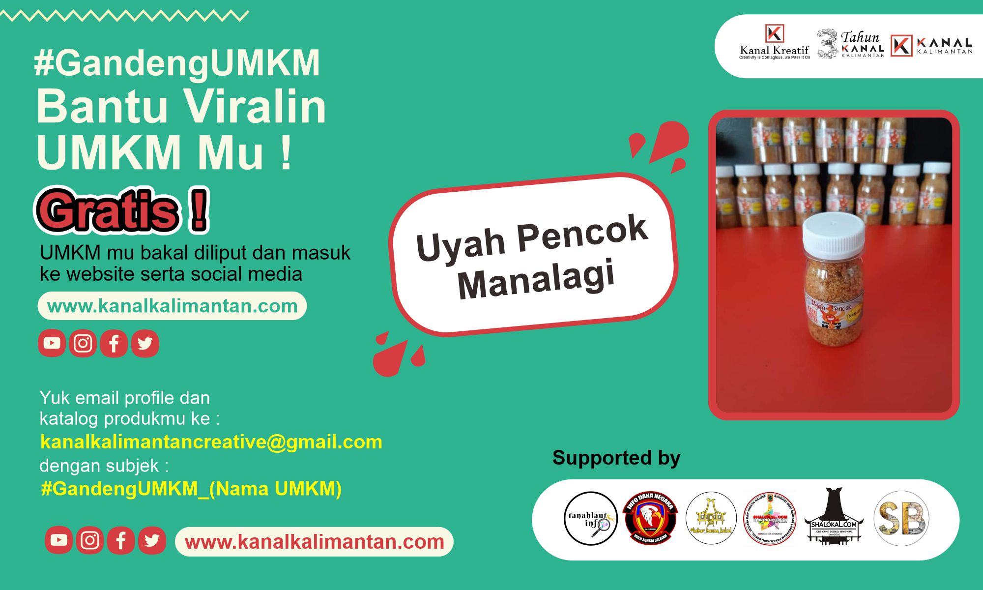 Program gandeng UMKM yang  dilaunching Kanalkalimantan.com, yakni menghadirkan liputan eksklusif bagi para pelaku UMKM di Kalimantan Selatan tanpa dipungut biaya alias gratis. Setiap UMKM yang sudah mengirimkan profil dan katalog produknya, akan dipublikasikan di web Kanalkalimantan.com dan semua akun media sosial kami.