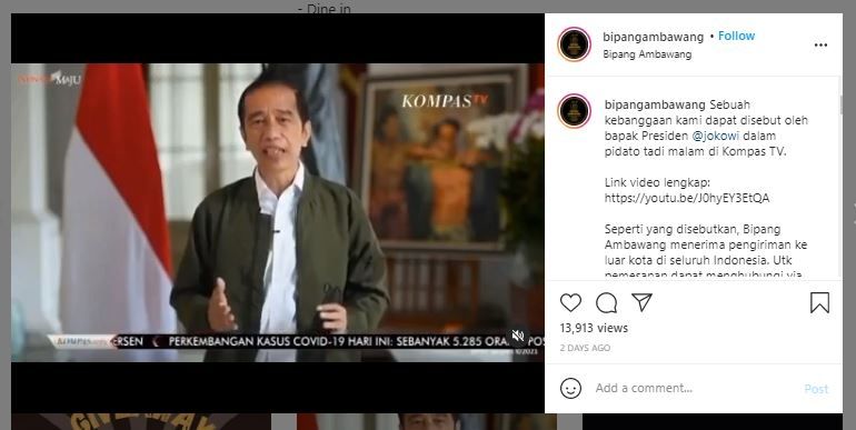 Berkaitan dengan adanya larangan mudik, Presiden Joko Widodo menyarankan untuk membeli kuliner khas daerah secara daring. Ia menyebutkan sejumlah makanan seperti gudeg dari Yogyakarta, Pempek dari Palembang, Bipang Ambawang dari Kalimantan, dan lainnya.