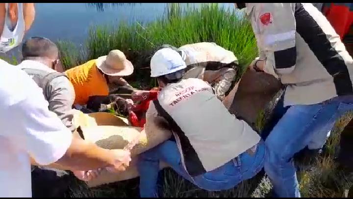 Petugas kepolisian bersama relawan emergency langsung mengevakuasi mayat pria tersebut ke atas, dan petugas langsung menutup mayat tersebut menggunakan tikar purun.