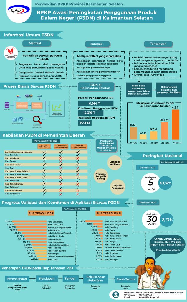 Berdasarkan data yang dirilis Badan Pengawasan Keuangan dan Pembangunan (BPKP) Provinsk Kalsel per tanggal 29 Mei 2022, progres RUP yang tervalidasi ke produk dalam negeri di Kota Banjarbaru telah mencapai 97,27 persen. Capaian progres ini merupakan yang paling tinggi di antara kabupeten kota yang ada di Kalsel.