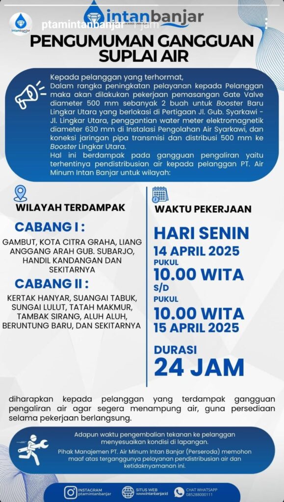 KANALKALIMANTAN.COM, BANJARBARU – PT Air Minum (PTAM) Intan Banjar mengumumkan adanya gangguan distribusi air yang akan terjadi selama sehari penuh pada Senin (14/4/2025) hingga Selasa (15/4/2025).