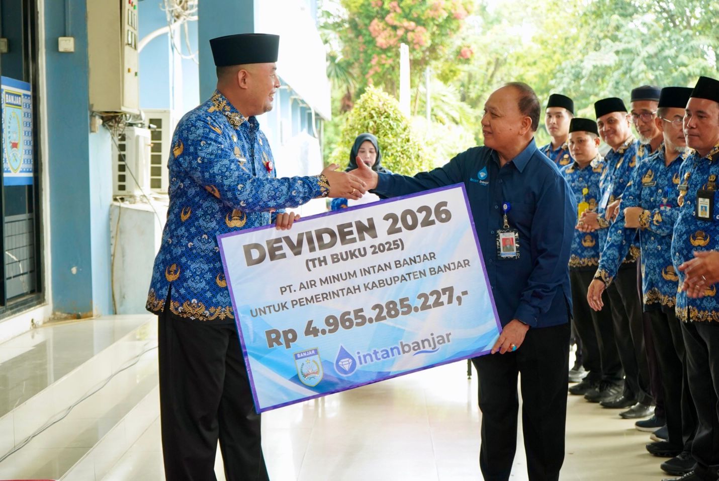 Dividen tahun buku 2025 tersebut diserahkan oleh Direktur Utama PT Air Minum Intan Banjar, Syaiful Anwar dan diterimakan oleh Sekretaris Daerah Kabupaten Banjar H Yudi Andrea.