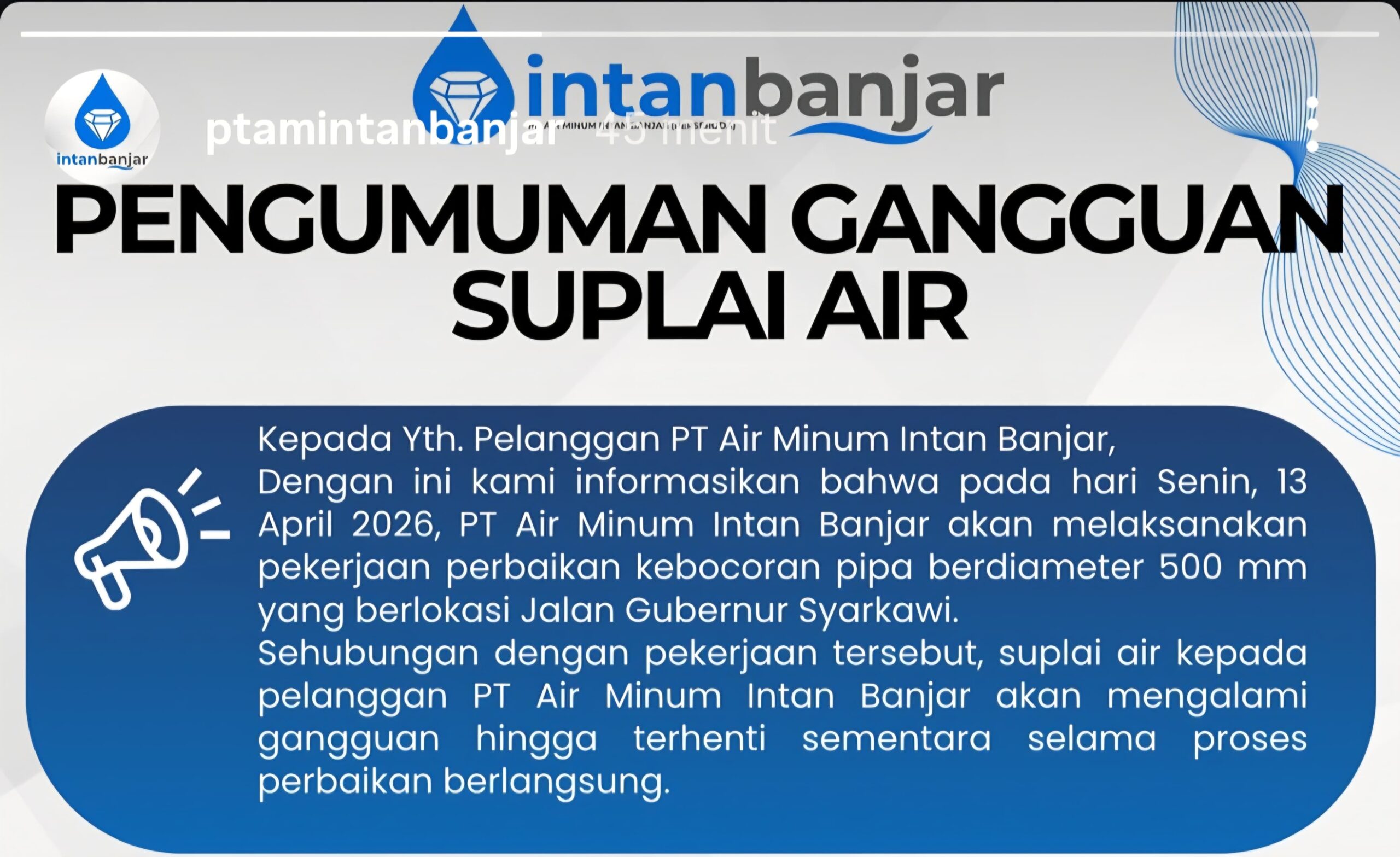 Berdasar pengumuman yang dilakukan PTAM Intan Banjar di akun resmi pada sosial media mereka akan dilaksanakan pekerjaan perbaikan kebocoran pipa berdiameter 500 mm yang berlokasi Jalan Gubernur Syarkawi.