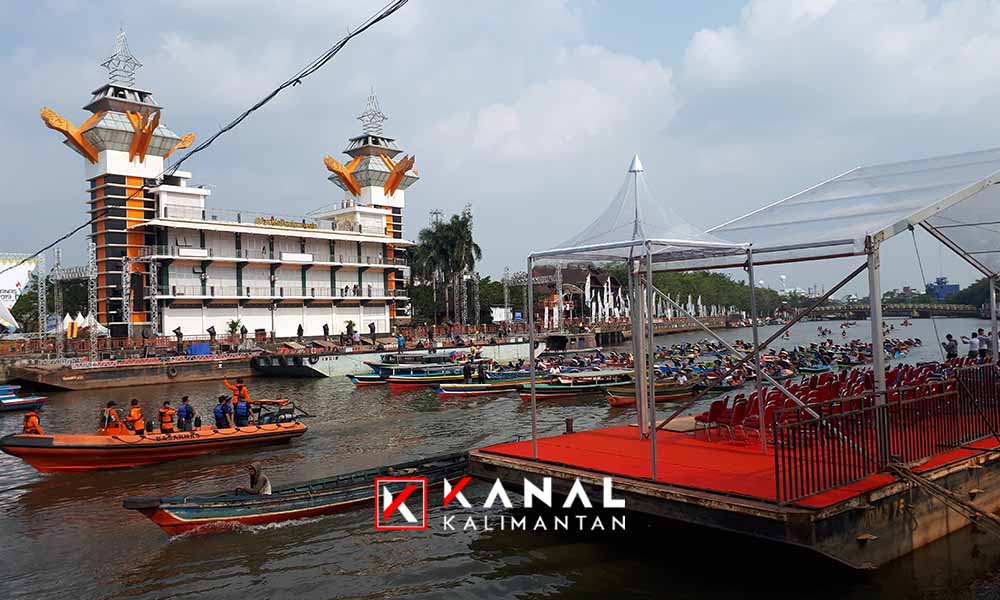 Sabtu (7/9) sore, terpantau panitia tengah merapikan deretan kursi tamu undangan, mempersiapkan panggung, hingga pengecekan sound system. Selain itu pihak keamanan juga berjaga menggunakan kapal di sepanjang sungai Martapura. Bersamaan, di tempat yang tidak berjauhan, puluhan klotok tampak melakukan gladi persiapan.