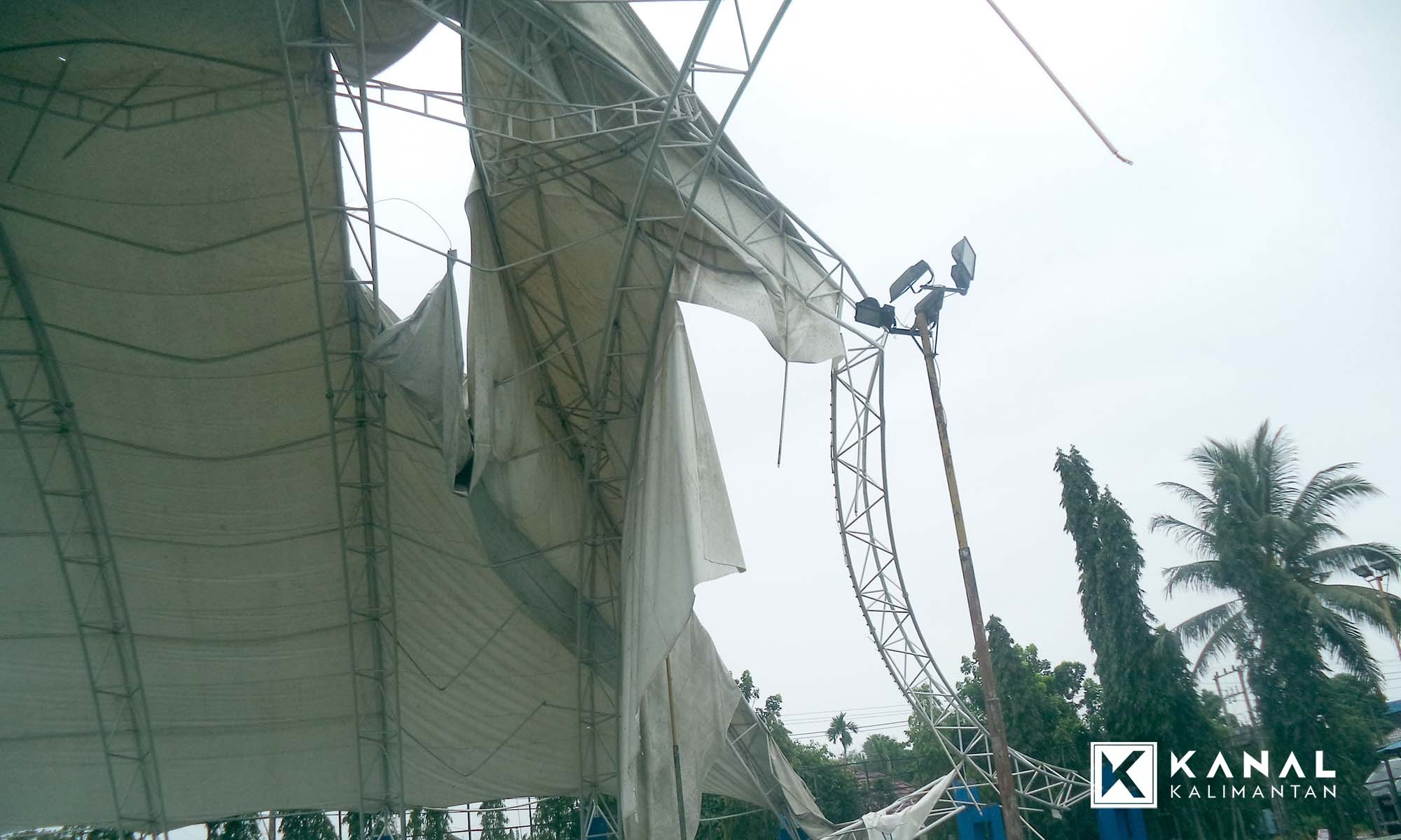 “Ambruknya lapangan karena di luar kehendak daya dukung dari memberan yang dihitung berdasarkan pembebanan standar. Yang kita ketahui dengan kecapatan angin maksimum, tidak mampu menahan beban akibat adanya puting beliung yang pada saat itu melebihi percepatan perencanaan,†jelasnya.
