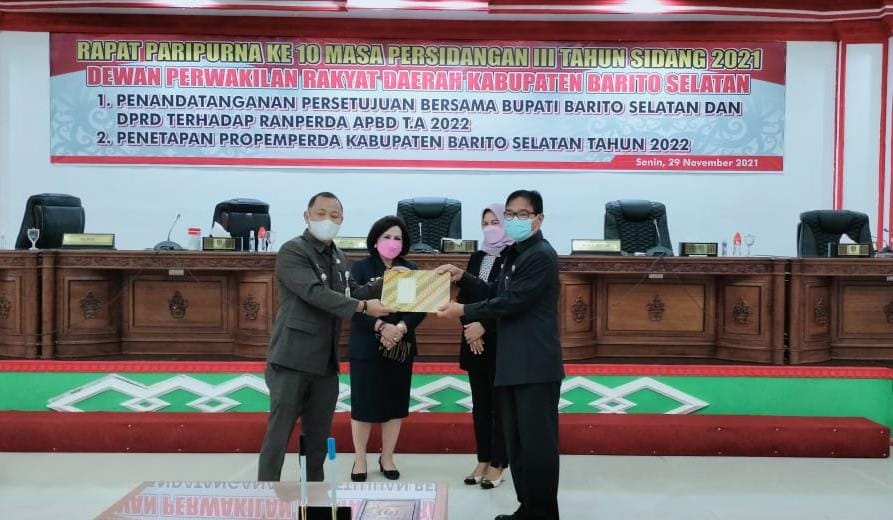 KANALKALIMANTAN.COM, BUNTOK – Rapat paripurna ke 10 DPRD Barito Selatan (Barsel) menyepakati Rancangan Peraturan Daerah (Raperda) APBD tahun anggaran 2022 dan penetapan Propemperda tahun 2022, Senin (29/11/2021).