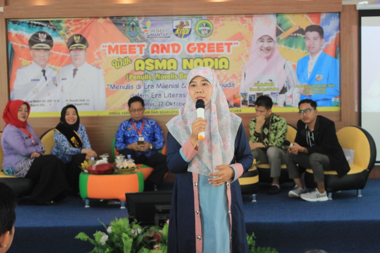 AMUNTAI, Tidak hanya bersuafoto dan meminta tanda tangan, sebanyak 298 peserta yang notabene dari kalangan pelajar dan mahasiswa antusias mengikuti “Meet And Greet With” novelis nasional Asma Nadia yang digelar di Aula Perpustakaan dan Kearsipan Daerah Kabupaten Hulu Sungai Utara (HSU), Kamis (17/10).