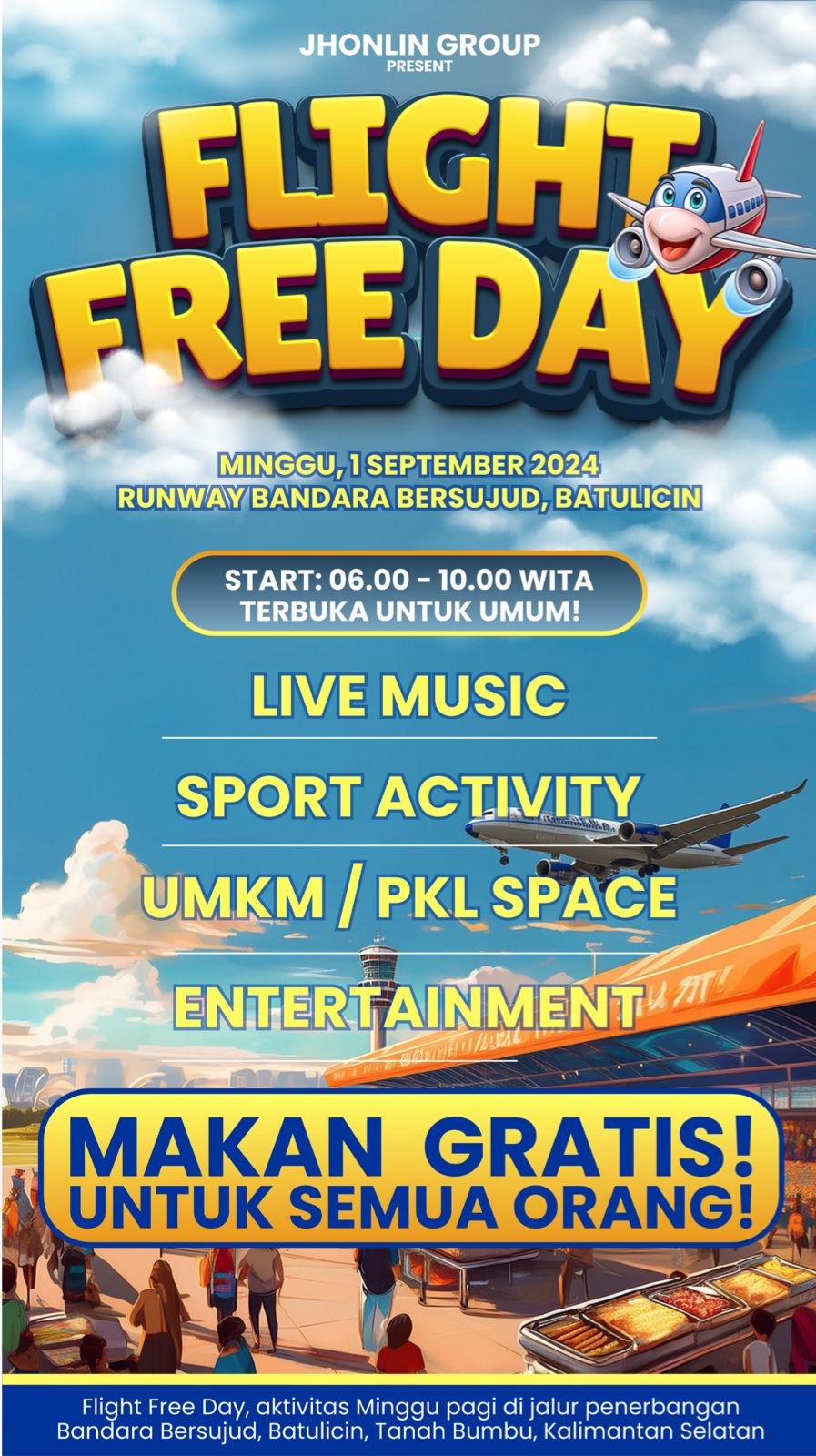 KANALKALIMANTAN.COM, BATULICIN – Jhonlin Group kembali olah gawi. Kali ini Flight Free Day di Runway Bandara Bersujud, Jalan Kodeco KM 2, Kecamatan Simpang Empat, Kabupaten Tanah Bumbu, Kalimantan Selatan, Minggu (1/9/2024) besok.