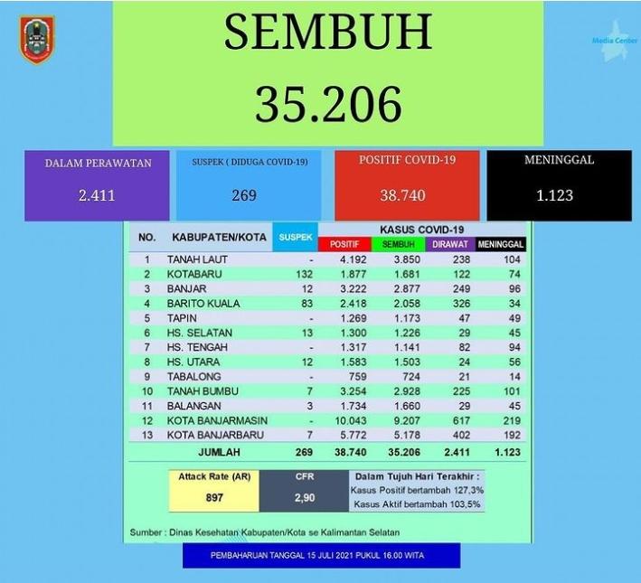 Secara kumulatif dinyatakan total sembuh 35.206, dalam perawatan 2.411, diduga covid-19 269, positif 38.740, dan meninggal 1.123. Angka serangan naik menjadi 897 dan angka kematian tetap 2,90. Secara kumulatif dalam 7 hari terakhir kasus positif bertambah 127,3 persen dan kasus aktif bertambah 103,5 persen. (Kanalkalimantan.com/nurul)
