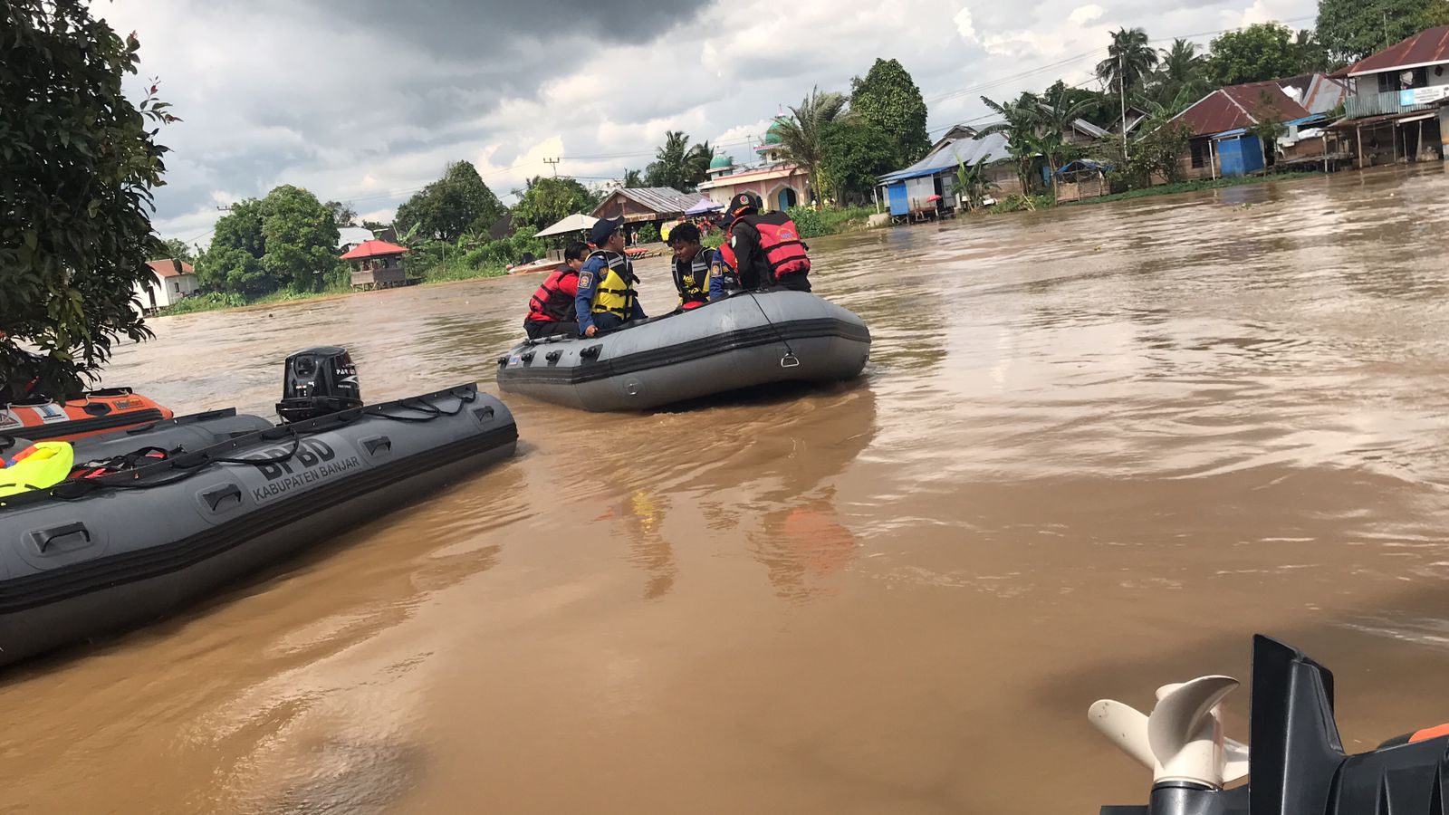 Masih menggunakan perahu karet para petugas menyisir bagian Sungai Martapura yang berwarna cokelat itu.