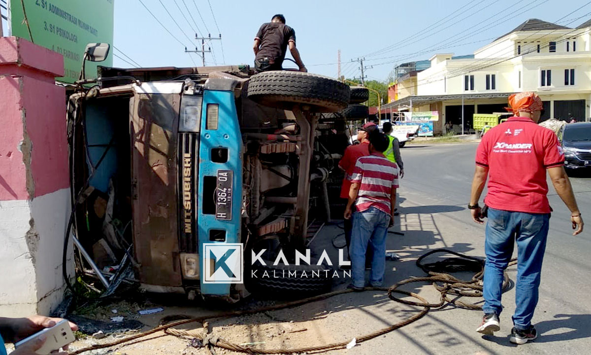 Terlihat kerumunan warga dan pengendara jalan tampak menyaksikan sebuah truk peti kemas dengan nomor polisi H 1364 DA yang terbalik di pertigaan jalan Trikora dan jalan mistar Cokrokusumo Banjarbaru.