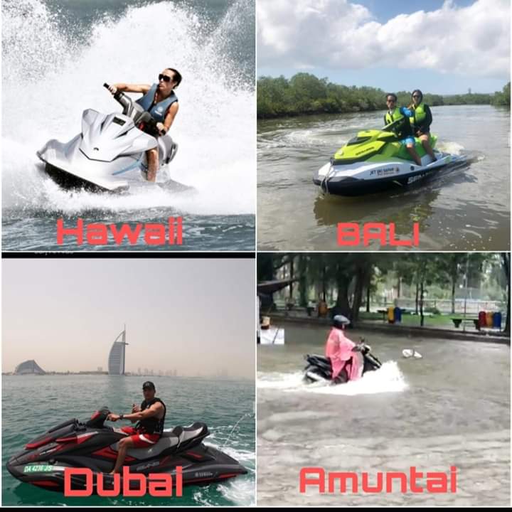 Selain itu, ada juga yang menarik dari postingan warga net, seolah membanding-bandingkan momen pengguna motor di tengah banjir di kota Amuntai dengan tempat wahana rekreasi dari penjuru dunia mulai dari menggunakan jetski di Bali sampai dengan di Dubai.