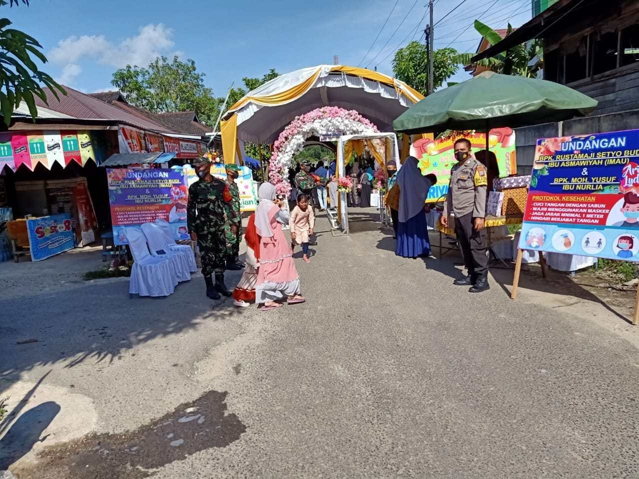 Anggota Bhabinkamtibmas Polsek Banjarbaru Barat Bripka Heru bersama Babinsa Sertu Suladi mengawasi ketat resepsi pernikahan dengan turun langsung. Pihak tuan rumah sudah menyiapkan alat cuci tangan, hand sanitizer serta menerapkan penggunaan masker bagi tamu yang datang serta kursi makan diatur jaraknya.
