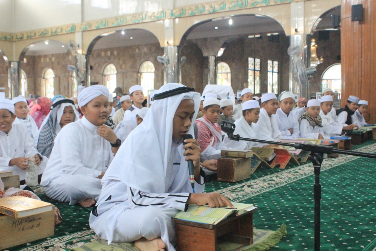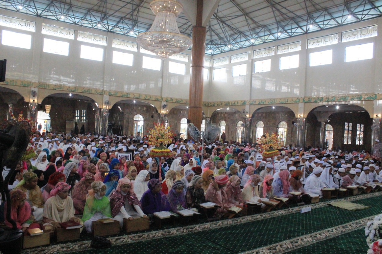 Ribuan peserta khataman Al Qur’an khusuk melantunkan ayat-ayat suci Al Qur’an mengalun merdu dari dalam Masjid Raya At Taqwa.