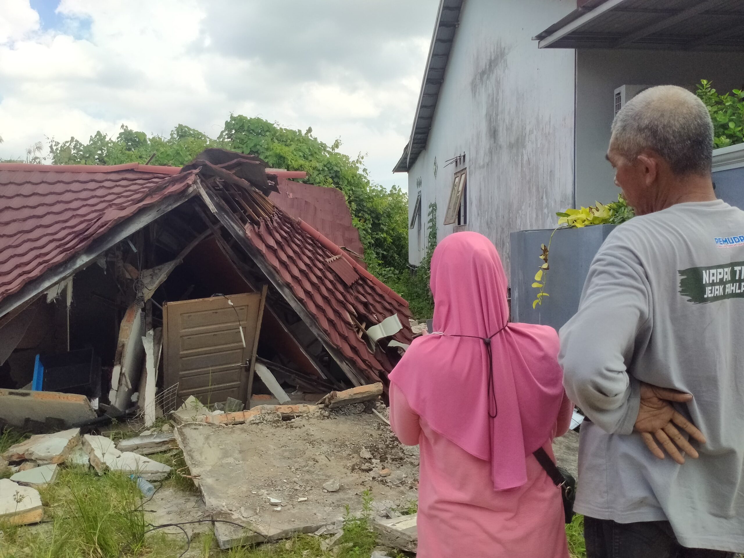 “Saya ada di kamar belakang sedang rebahan, terus ada suara retakan, runtuhnya itu awalnya dari depan,” kata Ritar.